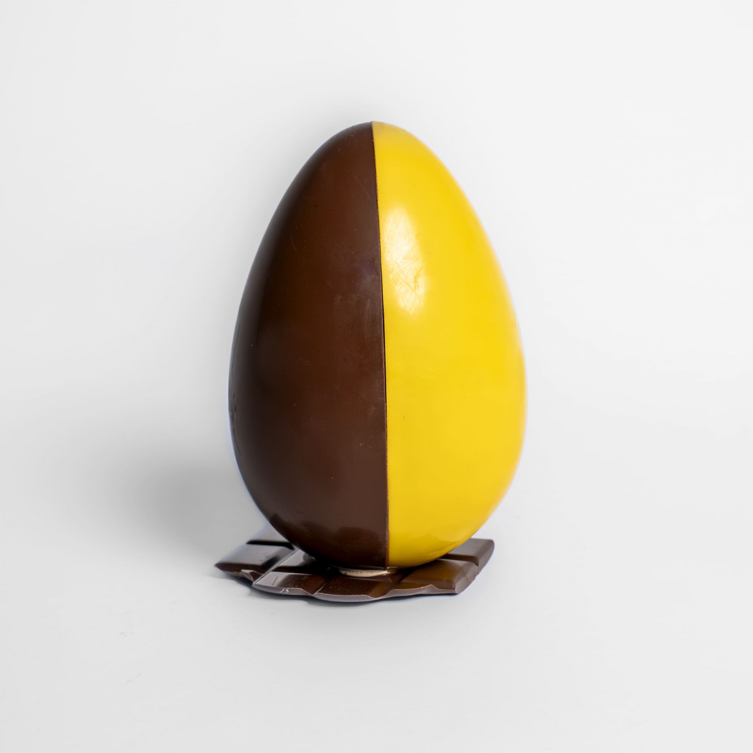 Trois œufs en chocolat noir et lait, délicatement garnis de notre praliné du Piémont.